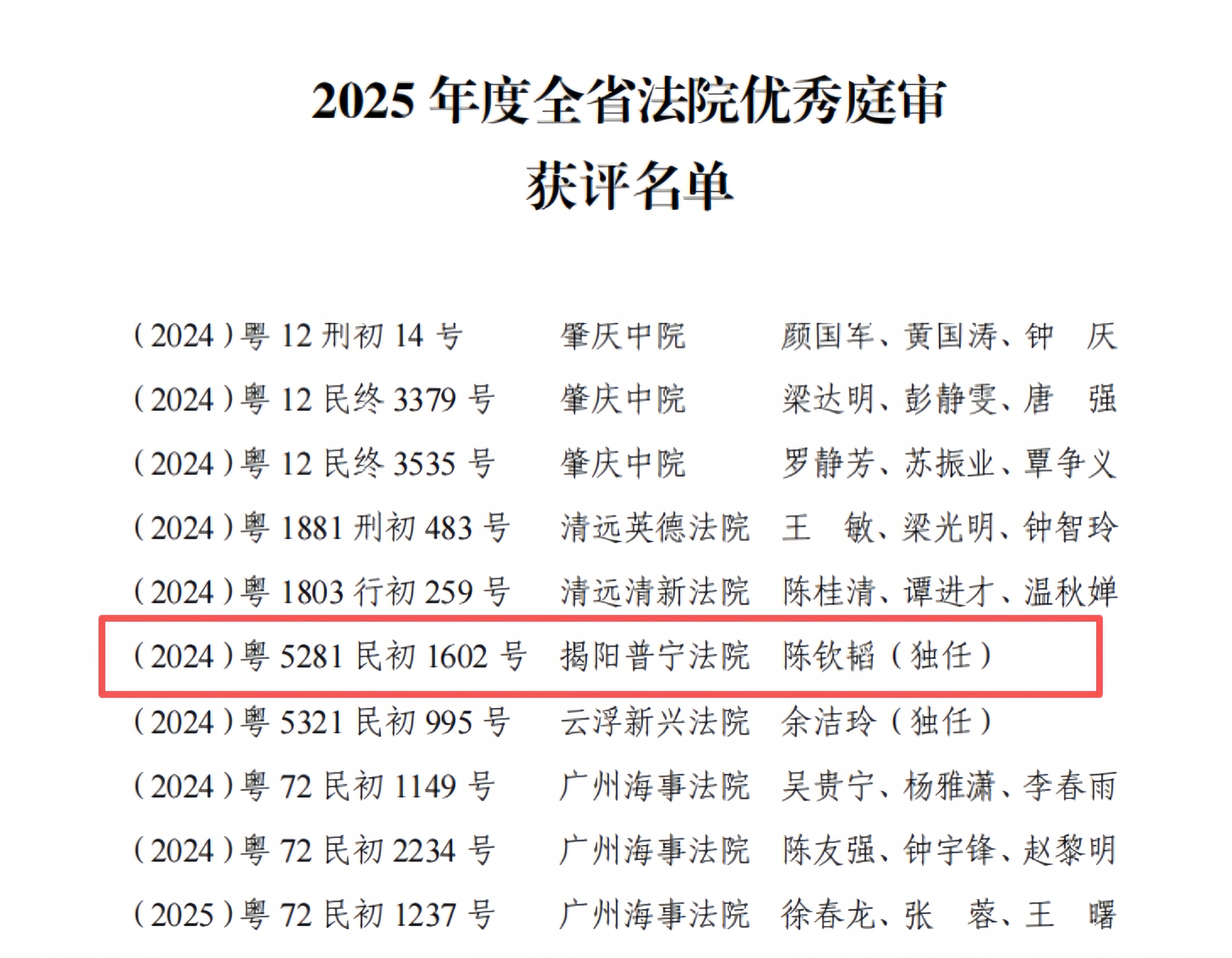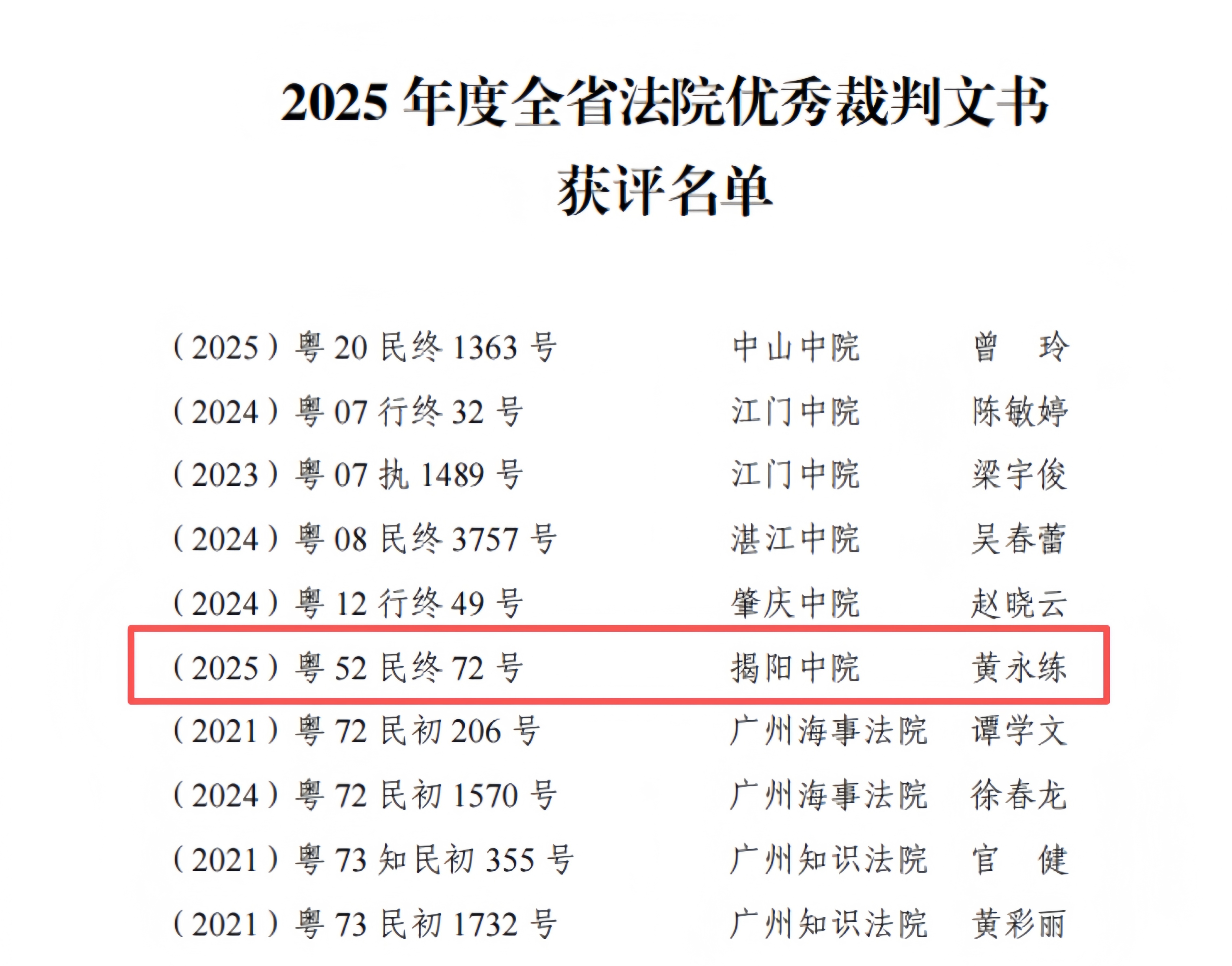 近日,广东省高级人民法院公布了2025年度全省法院优秀裁判文书、优秀庭审评选结果。经全省各地法院初评,省法院组织全省知名院校法学专家及审判业务专家复评,共评选出50篇优秀裁判文书和50场优秀庭审。其中,揭阳市中级人民法院民事审判第一庭庭长黄永练主办的(2025)粤52民终72号文书被评为全省法院优秀裁判文书,普宁市人民法院洪阳人民法庭庭长陈钦韬独任审理(2024)粤5281民初1602号庭审被评为全省法院优秀庭审。 优秀裁判文书、优秀庭审是人民法院的重要审判成果。揭阳法院将以此次评选活动为契机,锚定“争先进位,提质增效,建设新时代现代化法院”工作目标,坚持司法为民、公正司法,培育打造更多高质量裁判文书和优秀庭审,努力让人民群众在每一个司法案件中感受到公平正义。